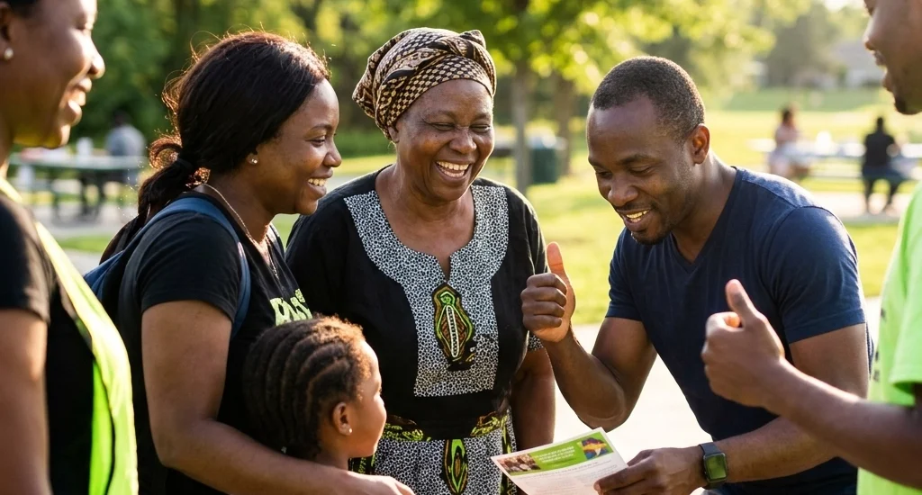 African community members in Nebraska discussing Medicaid work and community engagement rules.